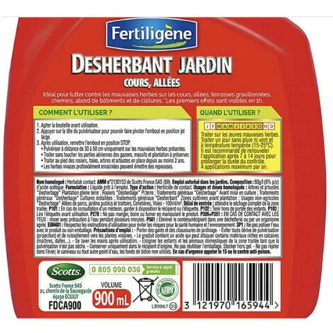 Presentazione : L’esterno della vostra casa è invaso dalle erbacce? Grazie a questo diserbante FERTILIGEN, potrete distruggere efficacemente le erbacce nel vostro giardino, nel vostro cortile, nel vostro vialetto o anche sul vostro terrazzo. I primi risultati sono visibili 1 ora dopo l’uso. Questo prodotto può essere utilizzato da marzo a ottobre. Leggere sempre attentamente l’etichetta e le istruzioni del prodotto prima dell’uso. Vantaggi : Elimina rapidamente le erbacce: effetti visibili in 1 ora Facile da usare Pronto all’uso Caratteristiche : Periodo di utilizzo: da marzo a ottobre Base: acido acetico Capacità: 1 L Rif. KBTPVN Imballaggio : Un diserbante FERTILIGEN – 900mlConsegnato nella confezione originale