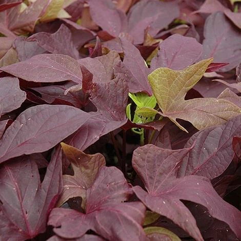 Ipomea “Sweet Caroline Light Copper”, pianta perenne sempreverde ricadente tuberosa, coltivata come annuale, con foglie da cuoriformi a trilobate, molto ornamentali e di colore rosso-bordeaux. Sviluppa fiori campanulati bianco-rosato. Portamento ricadente, può raggiunge 150 cm di lunghezza, è ideale per decorare terrazzi, balconi e facciate, arrampicata su pergole, archi o come tappezzante.Epoca fioritura: primaverile