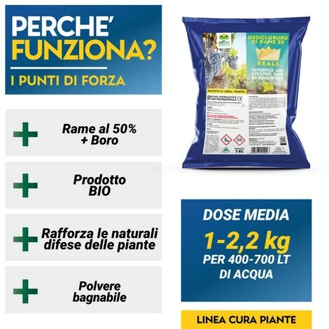 OSSICLORURO DI RAME REALE 50 va utilizzato per concimazione fogliare. Colture da frutto (melo, pero, pesco, ciliegio, albicocco, susino, agrumi) e vite: utilizzare 1,4 -1,8 kg/ha sciolti in 500-700 lt di acqua. Olivo: utilizzare 1,6-2,2 kg/ha sciolti in 500-700 lt di acqua. Fragola e colture ortive incluso il finocchio: utilizzare 1,8-2,2 kg/ha diluiti in 500-700 lt di acqua. Colture di pieno campo (barbabietola, cereali, riso, tabacco): utilizzare 1,0-1,4 kg/ha diluiti in 400-600 lt di acqua. Non effettuare applicazioni durante la fioritura.